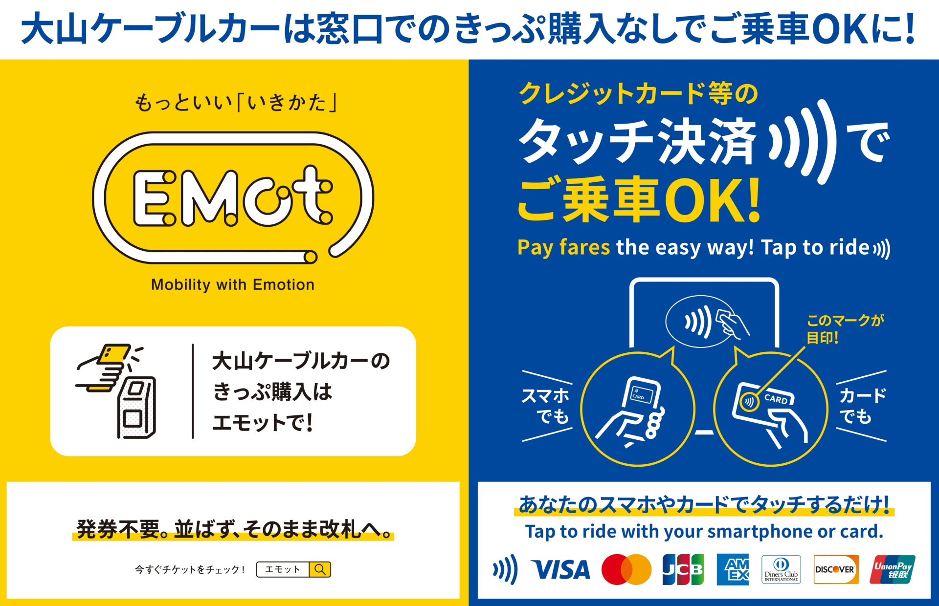 小田急電鉄が提供する「EMot(エモット)」のスマートフォンアプリまたはWebオンラインチケットで大山ケーブルカーの乗車券を発売いたします。