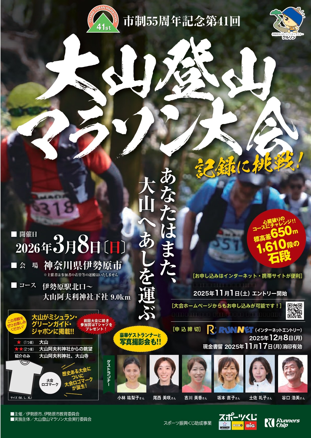 第41回大山登山マラソン大会が3月8日(日)に開催されます。全国各地から集結した2500人の選手が、スタートの小田急線伊勢原駅からゴールの阿夫利神社下社まで約9㎞、標高差650メートル・1610段の石段を駆け上がります。